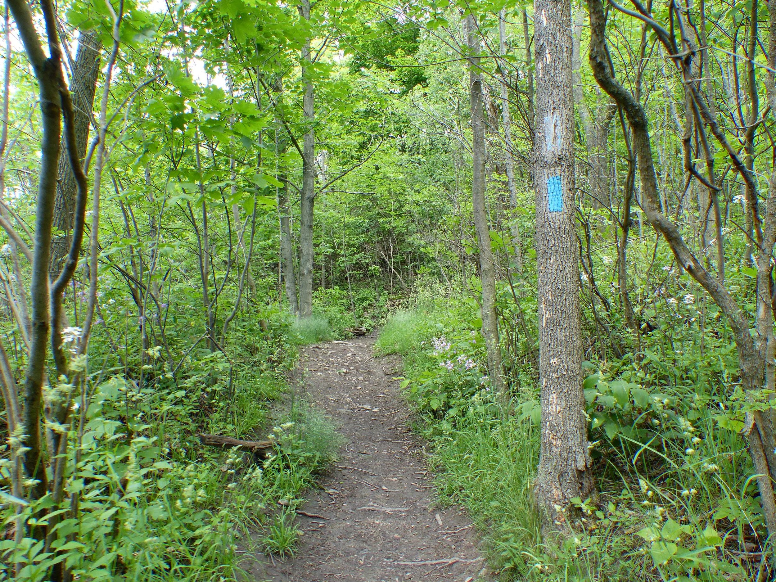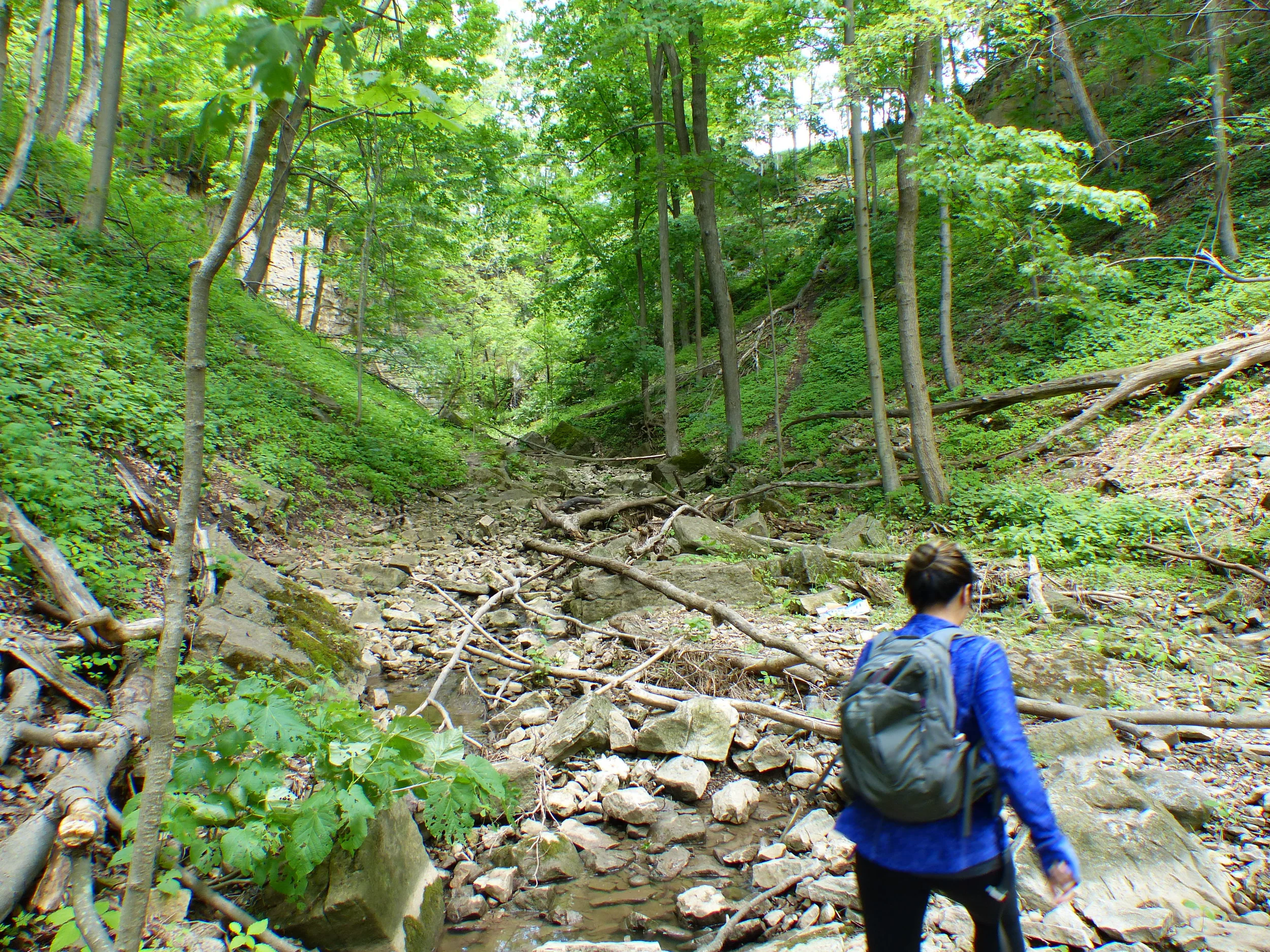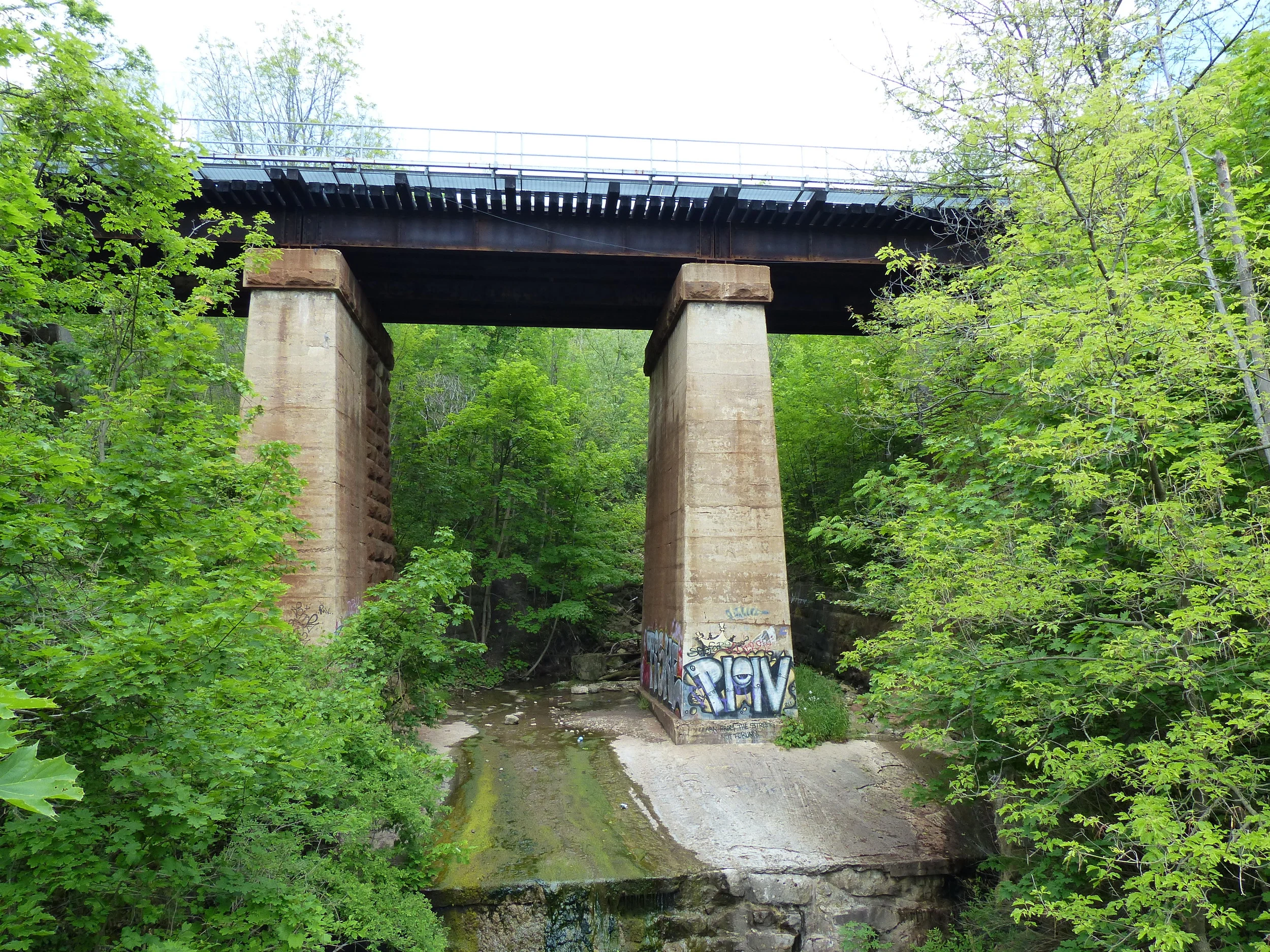 Park at Cascades Park and head up the gravel path. From the bridge, you can see Lower Sydenham Falls here. Don't fully cross the bridge, and head back to the left side of the stream. Head up the trail from here.