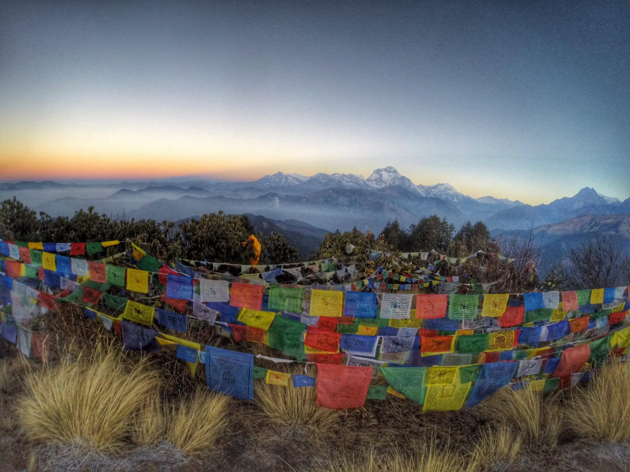 Once we made it up to the top, you'll find prayer flags surrounding the area. We took as many photos as we could, trying to beat the crowd of people waking up.