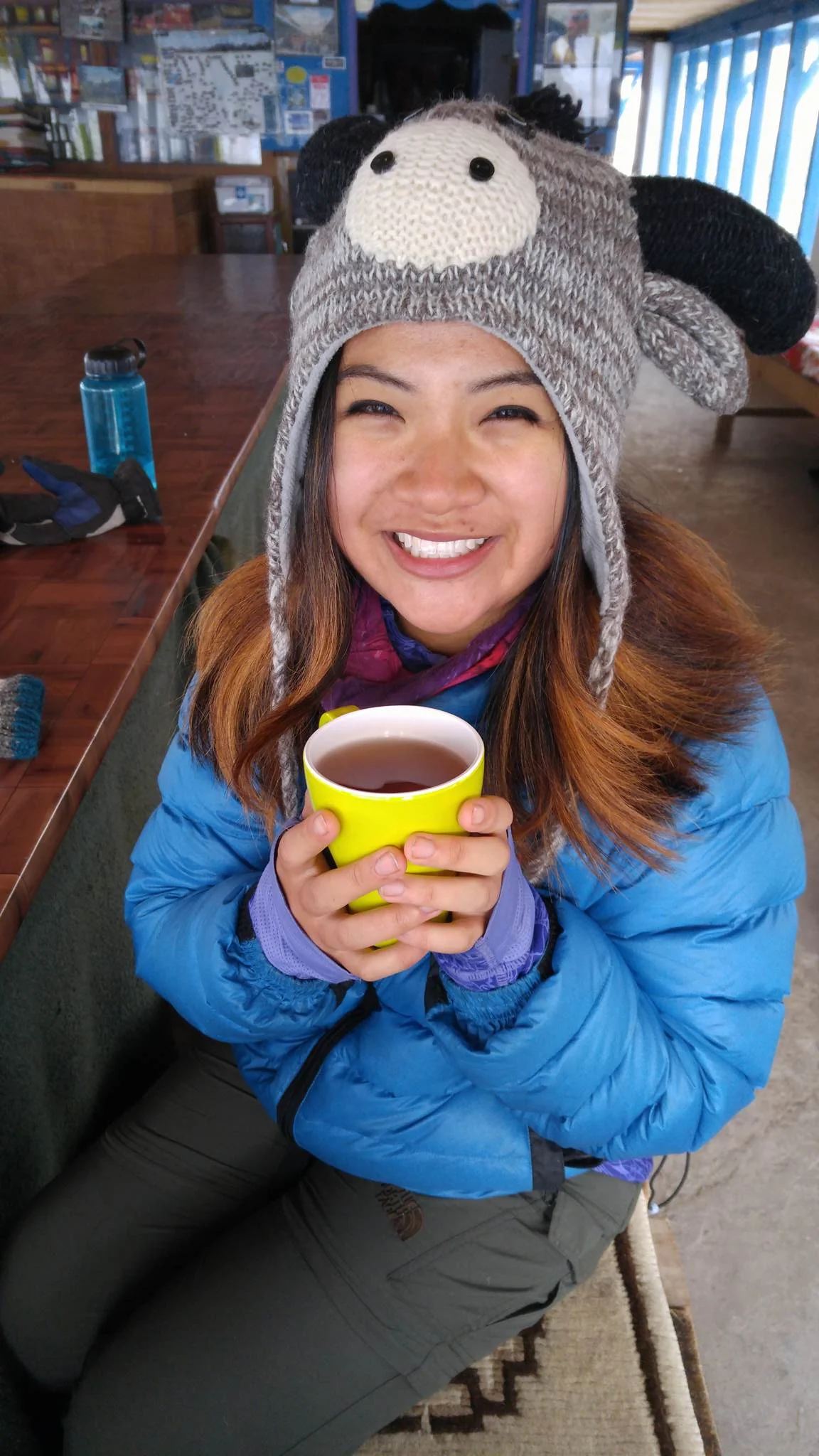 It's one of the newer hotels, so our guide wanted to try it out. There's only one communal washroom with poor lighting, so having a headlamp is really useful here. It's not as chilly here since you're at lower altitude, but there's a fire in the common room anyways.