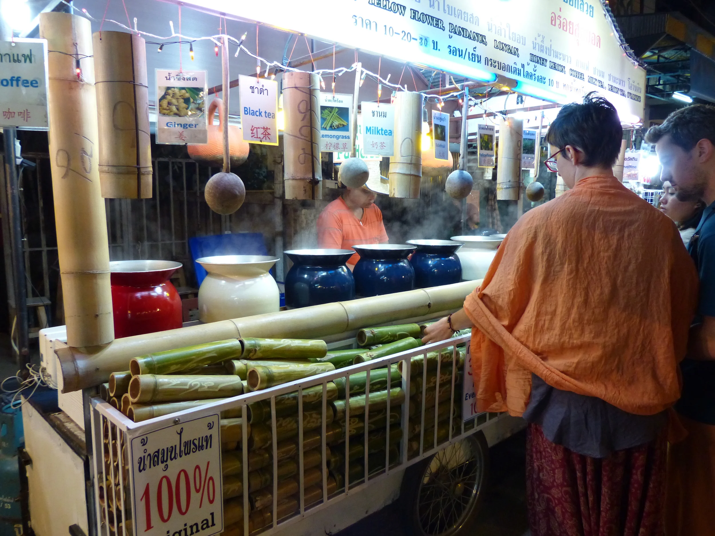 Every night, there's a night market along the main street in Pai. It's really hard to miss. There's a ton of carts that offer different foods, snacks and drinks. Try the cart with the tea in a bamboo cup!