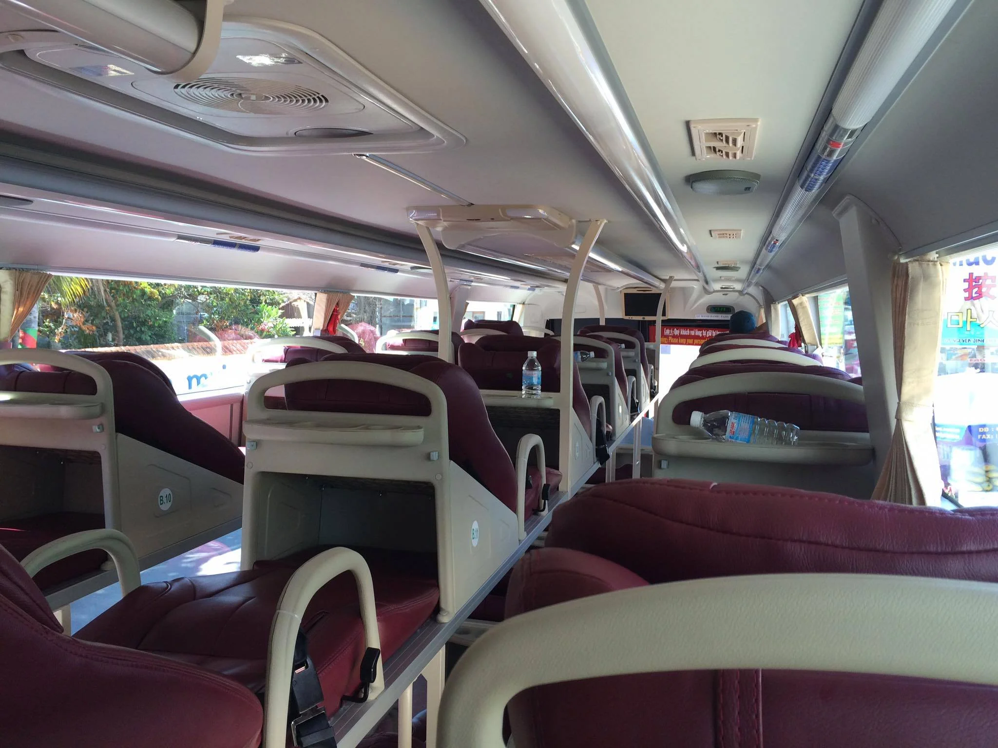 At first glance, it's not too terrible. There's an upper and lower bunk with three rows of seats. The seats are made of leather and it reclines pretty far back. The seats have small railings on the side, so you won't fall out as easily. Although, some seats have broken railings and dysfunctional seat belts. Safety first, right?
